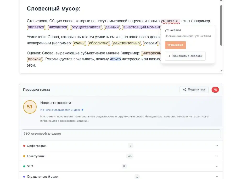 На сайте появился инструмент подготовки материалов к публикации. Вставляете черновик — через 2 секунды видите подсвеченные опечатки, стилистические проблемы и рекомендации по структуре. Ошибки сгруппированы по категориям, при клике на любую — курсор перемещается к нужному фрагменту.